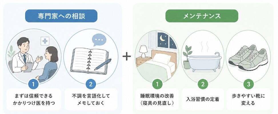 ここでのポイントは、今の生活の中でお金・労力・時間を無理なく捻出できる範囲のメンテナンスを特定することです。信頼できるかかりつけ医を探したり、日常の睡眠・入浴習慣にちょっとしたアイテムを導入したりするなど、指針となるメンテナンスを無理なく取り入れてみましょう。