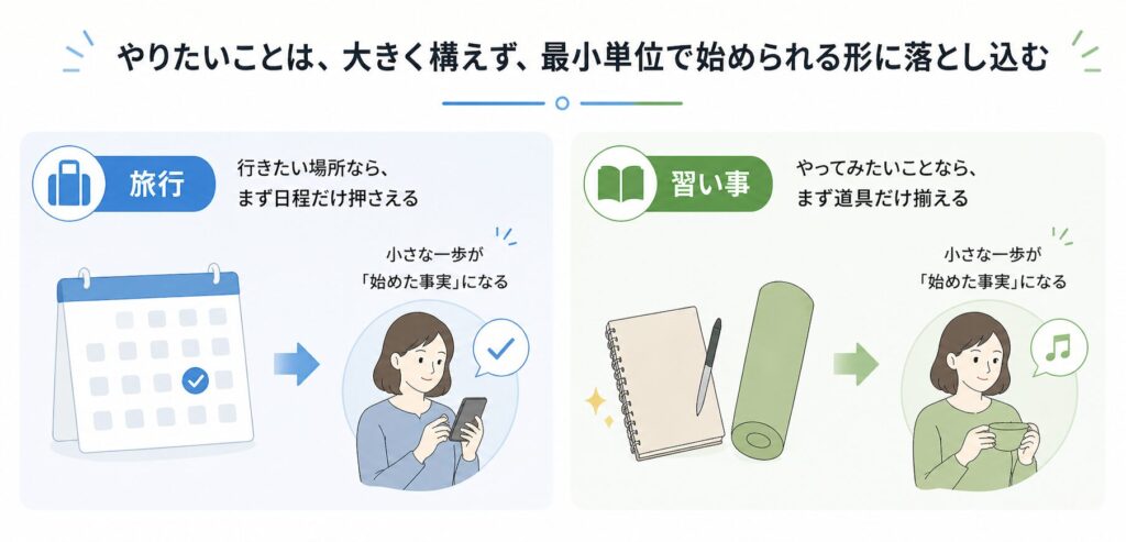 行きたい場所なら、まず日程だけ押さえる。やってみたいことなら、まず道具だけ揃える。完成形を目指すより、始めた事実をつくることが先送り癖を崩す起点になります。