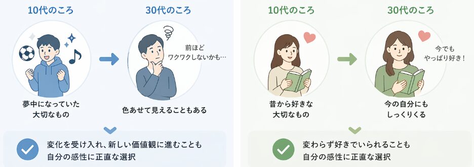 幸せの定義を更新することは、過去を否定することではありません。素直な心で現状の基準を信じることにあります。10代のころに夢中になっていたものが30代で色あせて見えることもあれば、周囲から何を言われても昔から好きなものがそのまま感じられることもあります。いずれも自分の感性を否定しなければ、どちらも正解です。