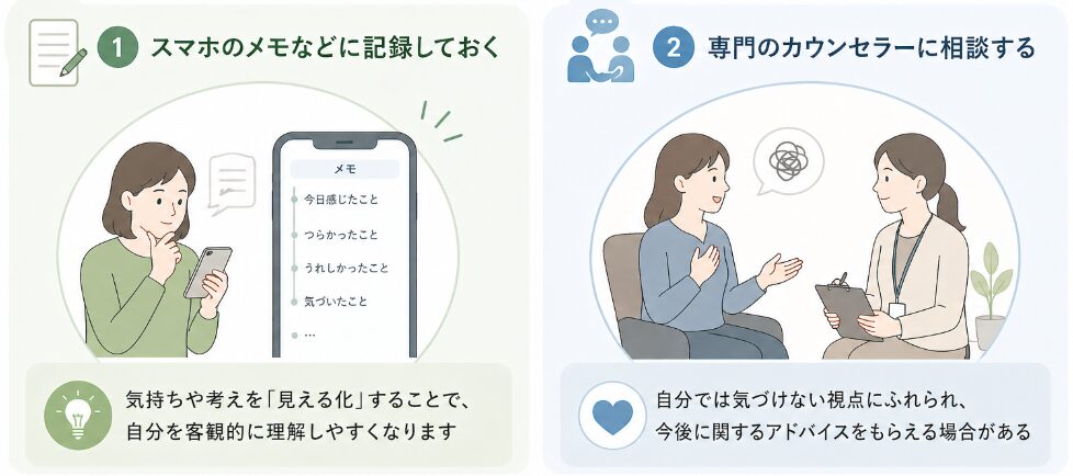職場の理不尽な指示や家庭内での役割の押し付けなど、その場で言い返せなくてもスマホのメモなどに記録しておくことで、自分の感情を受け止められます。その記録を後で気分がフラットなときに見返して、重大な決断を論理的に判断することも可能です。その他にもお金がかかる場合が多いものの、専門のカウンセラーに悩みを受け止めてもらい、今後に関するアドバイスをもらうことも有効です。
