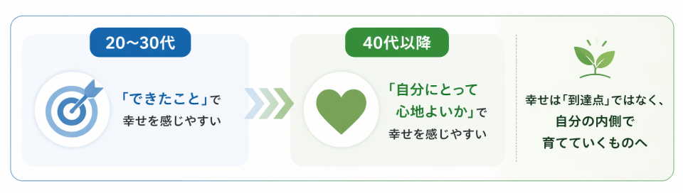 20〜30代の幸せは、昇進、収入、結婚、出産といった、いわば社会的なチェックリストを埋めていく工程に近い場合が多く、客観的にも可視化されやすいことからある種の競争感があります。これが充実感になるか、不快感になるかは人によります。